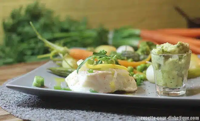 On se fait plaisir avec des légumes et du poisson: le tout cuit à la vapeur.Tout ça, s’est bien light, alors on fait un petit écart avec une Béarnaise revisitée histoire d’apporter un peu de lipides pour l’équilibre du repas !
