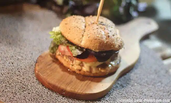 Moins de 40g de glucides par hamburger - le pain complet a un IG plus bas et un apport en fibres.