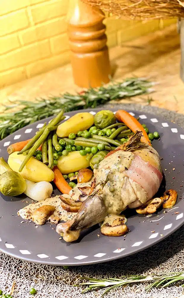 - Entourer les cuisses de pintades déjà préparées avec un tranche de lard et coincer une branche de romarin dedans. saler et poivrer et enveloppez les avec du film cellophane (au moins 2 tours)