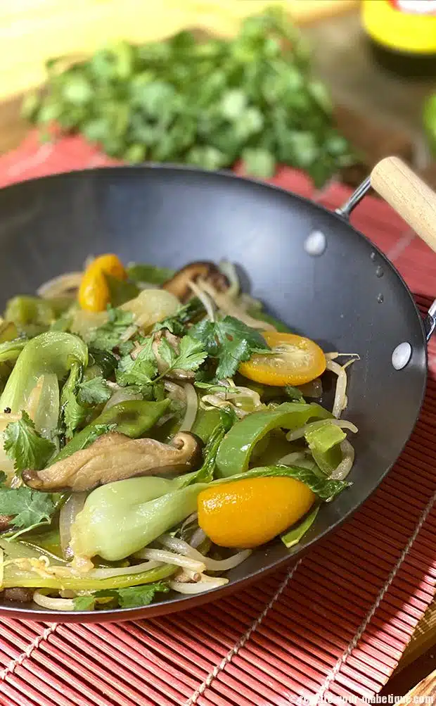 - Faire revenir 2 minutes les shiitakés dans une sauteuse avec un peu d'huile d'olive (ou du beurre) - ajouter la ciboule, les poivrons et le Pak Choir - faire revenir 23 minutes - ajouter enfin les pois gourmands, le soja, les kumquats et le bouillon et laisser cuire à feu moyen pendant une dizaine de minutes. ajouter un peu d'épices à wok.