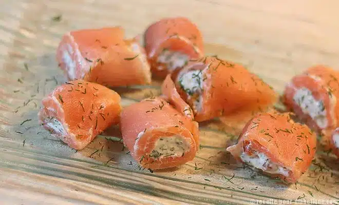- Tout simple ! Mélanger le fromage frais avec l'aneth, le jus de citron, l'huile d'olive et un peu de poivre moulu. Disposez sur le bord large des tranches de saumon et rouler. Mettre au congélateur 1 heure. Découpez ensuite chaque tranche en petit tronçons de 2/3 cm et réserver au frais jusqu'au service (ne pas servir tout de suite car ce sera gelé ! )