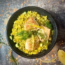 Dresser : risotto, courgettes, cubes de truite, aneth et graines de sésame.